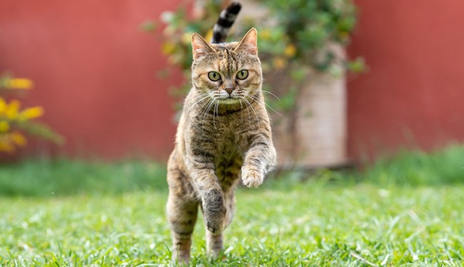 - A domestic cat can run as fast as 48 kilometers per hour. If you’ve seen your kitty charging around the house, you know that he/she can move pretty quickly.